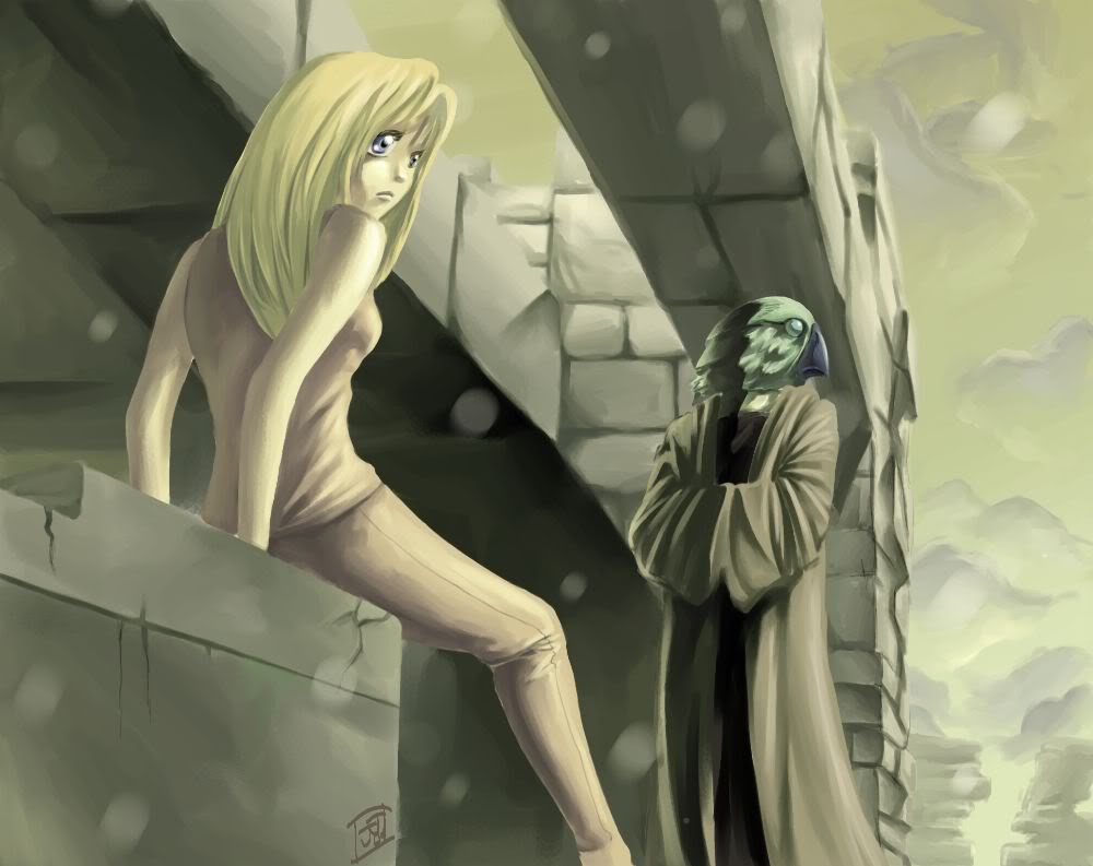 Poor little girl, searching for her parents in every relationship she comes in contact with.  When are you going to face the truth?  Your parents are dead, and only in death will you see them again.  Just like the sentient Varia armor, all alone without a master to wield it.  We should unite them I think.  Plogos take this girl to the Shrine of Prophesy.